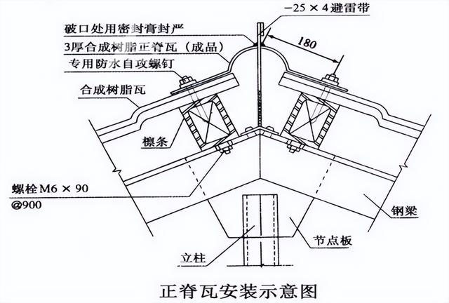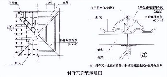 正脊瓦和斜脊瓦分別安裝在屋脊CD線和斜邊上。正脊瓦的安裝要從主瓦區(qū)的一側(cè)開始,確保第一張正脊瓦的搭接處不與主瓦的搭接處重疊,而是相互錯開。兩張正脊瓦之間要搭接一個波形,以確保防水性能。斜脊瓦安裝在多坡屋面的斜邊上,要確保上下對齊并固定在主瓦的檁條上,兩節(jié)斜脊瓦之間要搭接30mm,最后安裝脊瓦的末端。